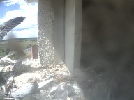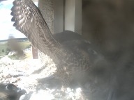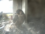 Ende Mai haben die Jungvögel ihr fertiges Gefieder und trainieren fleißig ihre Flügel auf dem Nistplatzbalkon. Ein beliebter Sitzplatz zu dieser Zeit ist auf der Kamera.