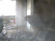 Vermutlich am 30.05.14, ca. 42 Tage nach dem Schlupf, wagten die vier Jungfalken ihren ersten Ausflug vom Nistplatz. Die hohen Dächer der Nachbargebäude waren dabei ihr erstes Ziel. In den folgenden Tagen suchten sie zwar immer wieder einmal den Nistkasten auf, doch die Zeitabstände ihrer Abwesenheit vergrößerten sich zunehmend. Während dieser Zeit erfolgte weiterhin die Nahrungsversorgung der sogenannten „Ästlinge“ durch die Altvögel.
