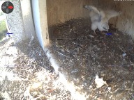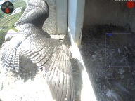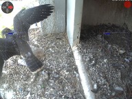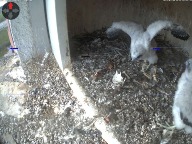 Nach den ersten ausgiebigen „Trockenübungen“ im Nistkasten, vor allem aber auch auf dem vorgelagerten Balkon, starteten die jungen Wanderfalkenterzel ihre ersten Ausflüge vor allem auf die hohen Bauwerke im Umfeld des Nistplatzes, Ende der 21. Kalenderwoche. Aus den anfänglichen kurzen Ausflügen entwickelten sich schnell längere Flüge, so dass die beiden Terzel immer seltener im und am Schacht 1, dem Nistplatzstandort, gesichtet werden konnten. Dafür schaute hin und wieder ein Turmfalke im Nistkasten vorbei.
